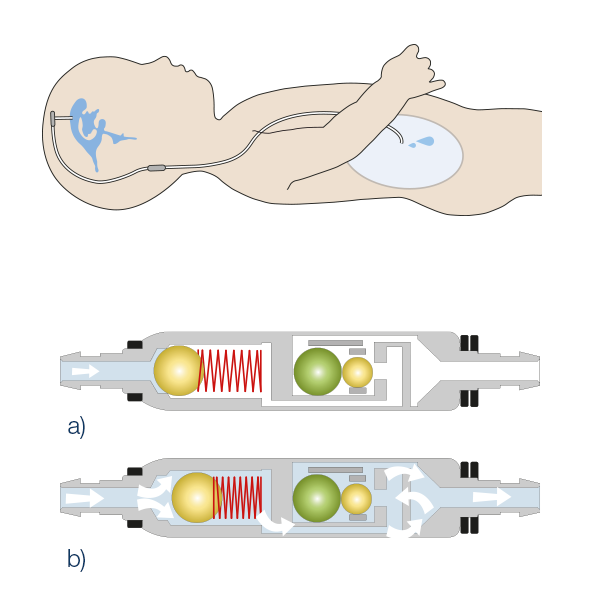 The paediGAV is manufactured from a solid and stable titanium housing. The proximal side consists of a Differential pressure unit. A spiral spring controls the valve opening pressure. The functioning of the gravitational unit on the distal valve side is ensured by a tantalum and a sapphire ball. The slim and cylindrical design makes implantation comparatively easy.