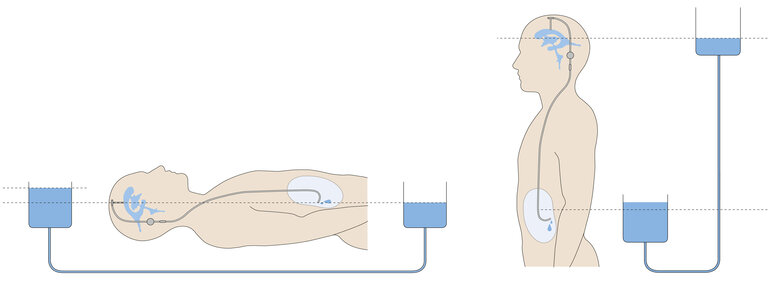 - Im Liegen: Kopf und Bauch befinden sich etwa auf gleicher Höhe. Es entsteht kein zusätzlicher Druck durch die Schwerkraft. Das Hirnwasser wird dann nur durch den Druckunterschied zwischen Kopf und Bauch abgeleitet.