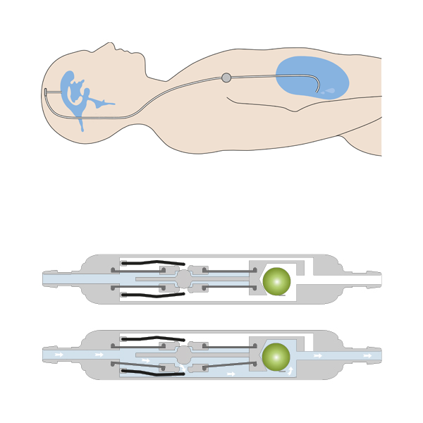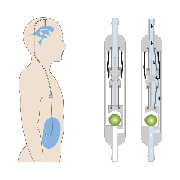 Das DUALSWITCH-VENTIL besteht aus zwei parallel angeordneten Ventilkammern, eine für die liegende und eine für die sitzende oder stehende Körperposition. Aufgrund dieser einzigartigen Konstruktion erkennt das Ventil eigenständig, ob sich der Patient in liegender oder in aufrechter Position befindet und stellt so immer den richtigen Ventilöffnungsdruck ein. Die unbeabsichtigte und auch gefährliche Überdrainage wird so effektiv verhindert.